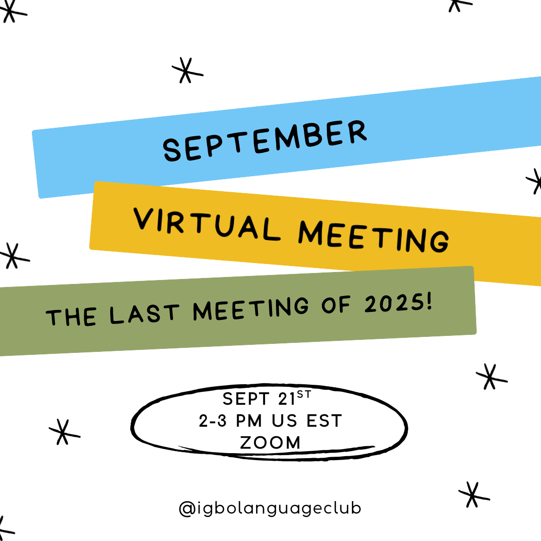 The last virtual meeting of 2025 will be held on Sunday, September 21st, from 2–3 PM US Eastern Time (11 AM-12 PM US PT, 7-8 pm BST, 7-8 PM WAT). American and International attendees will have the chance to win giveaway prizes. New members, beginners, and those who don’t attend consistently are strongly encouraged to join!